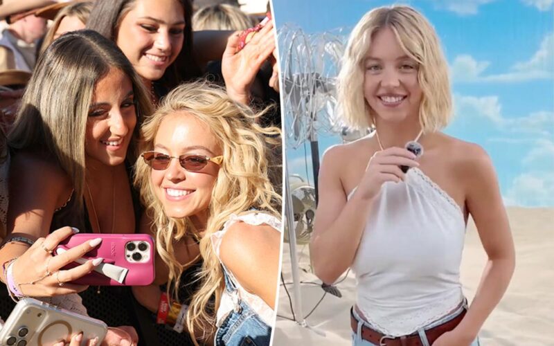 Sydney Sweeney takes photos with fans before watching rapper BigXthaPlug perform on the Mustang Stage during the Stagecoach Country Music Festival on April 24, 2026. Los Angeles Times via Getty Images