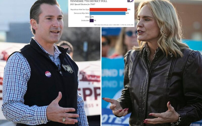 Republican Matt Van Epps leads Democrat Aftyn Behn — dubbed “AOC of Tennessee” — by just two percentage points, 48% to 46%, among likely voters in the Volunteer State’s 7th Congressional District, according to the survey by Emerson College Polling and The Hill. Of the remainder, 5% said that they were undecided and 2% said they would vote for one of three third-party candidates on the ballot.