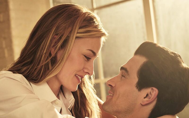 Paul Anthony Kelly as John F. Kennedy Jr. and Sarah Pidgeon as Carolyn Bessette holding hands.