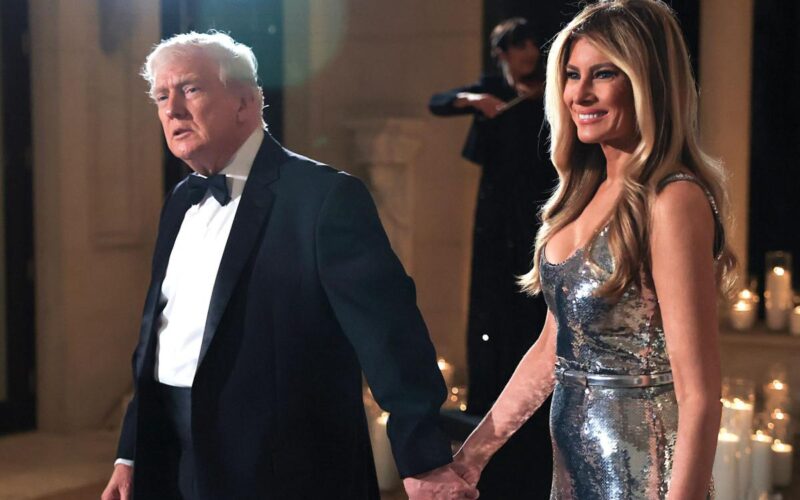 The president, wearing a tuxedo, briefly spoke to reporters outside the club’s ballroom, with Melania standing by his side in a stunning silver dress.