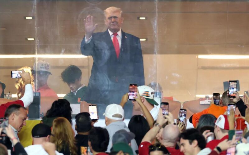 Trump waved to the crowd from a suite at Hard Rock Stadium during the singing of the national anthem ahead of the game between the Miami Hurricanes and Indiana Hoosiers.