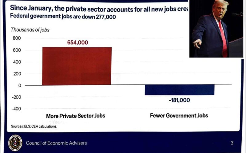 The president took to Truth Social to share a chart showing the private sector added 654,000 jobs “since January,” accounting for all new job creation in that period as federal government employment plunged.