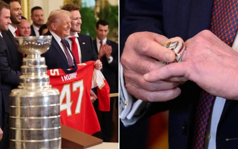 The team presented the president on Thursday with two championship rings, a golden hockey stick and a red jersey with a “47” and the name Trump on it. Trump is serving as the 47th president.