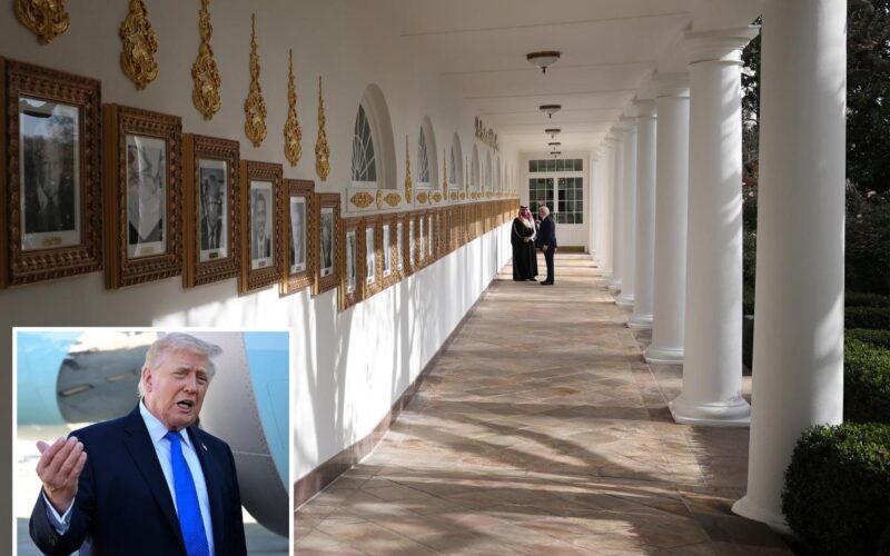 The covered, column-lined pathway runs alongside the Rose Garden and takes pedestrians past the Presidential Walk of Fame, Trump’s installation of framed portraits of past chief executives — and one auto pen, in the case of Joe Biden.