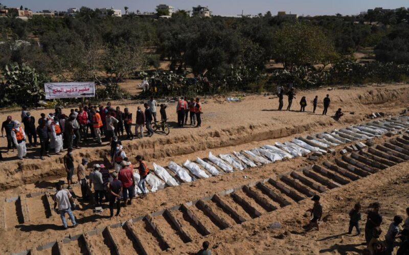 Bodies of unidentified Palestinians returned from Israel are buried in a mass grave in Deir al-Balah, Gaza Strip, Monday, Oct. 27, 2025. (AP Photo/Jehad Alshrafi)