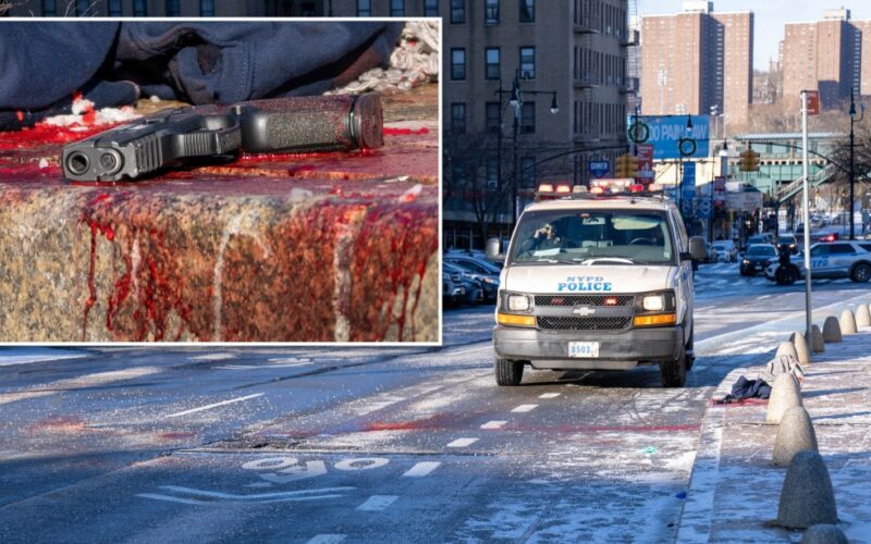The gunman fled the scene in a black SUV, cops said. A pistol was left at the scene in a sprawling pool of blood seen dripping off the curb.