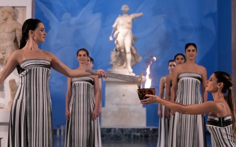 Despite moving indoors, Wednesday’s ceremony retained its traditional elements: sculptural dance gestures by performers dressed as priestesses and male kouroi, and invocations in Greek to the ancient gods.