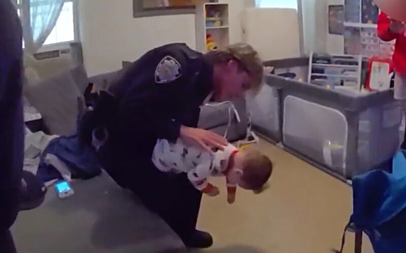 Body-worn camera video shows one of the officers taking the baby from a family member and vigorously patting the baby’s back more than a dozen times, ultimately dislodging what was in the baby’s throat.