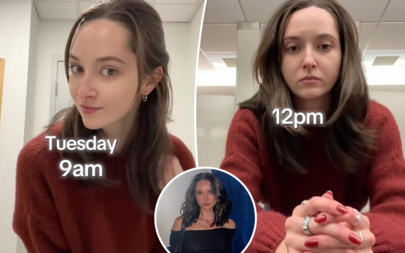 Her posts follow a before-and-after framework; in one video, Donlan films herself looking bright at 9 AM, describing her visage as hair clean, skin clear, and face not puffy. She then shows herself at 1 PM that same day with the update: “hair oily, eye bags dark, face puffy.”