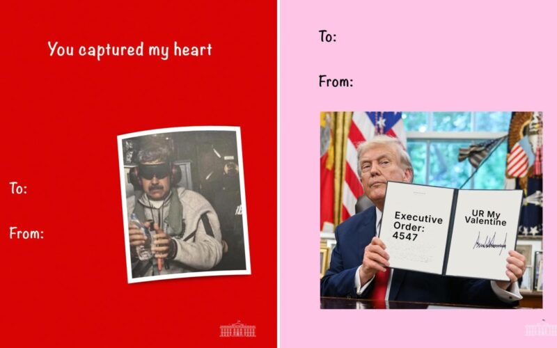 The White House released a series of irreverent Valentine’s Day cards on social media Friday featuring some of the most meme’d images of President Trump’s second term.