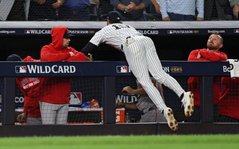 McMahon flew toward the Red Sox dugout at full speed to track down a pop fly in the top of the eighth inning to secure an out for Cam Schlittler’s historic performance. McMahon secured the ball and then flipped completely over the railing, landing hard on one of the visiting benches.